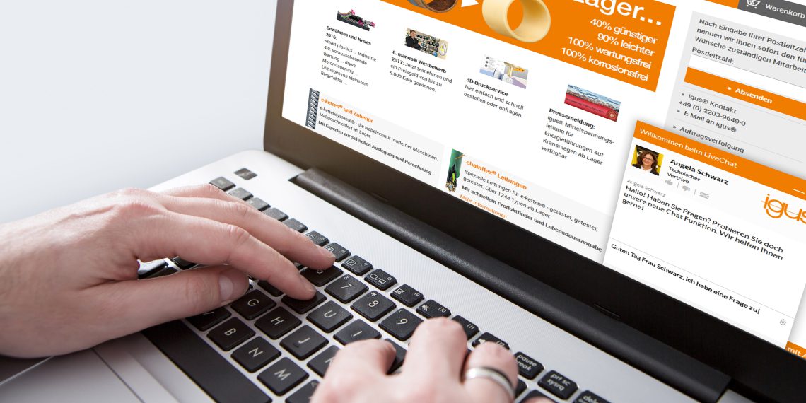 Mithilfe des LiveChats auf der igus Webseite haben Kunden jetzt eine weitere Möglichkeit einfach und schnell mit dem motion plastics Spezialisten in Kontakt zu treten. Ob Fragen zur Auslegung, neuen Produkten, der Werkstofftechnologie oder Preisanfragen, die igus Experten aus dem e‑ketten‑, Leitungs- und Lagertechnik-Vertrieb kümmern sich um die unterschiedlichsten Anliegen der Chat-Nutzer.