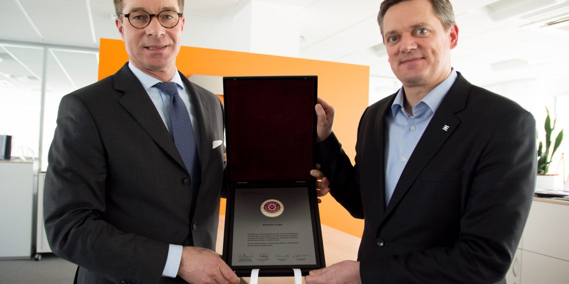 Das Detmolder Familienunternehmen Weidmüller erhielt am 14. März am Hauptsitz in Detmold von der Stiftung Familienunternehmen die Auszeichnung „Top 500 Familienunternehmen“. Stefan Heidbreder, Geschäftsführer der Stiftung, überreichte Weidmüller Vorstandssprecher Jörg Timmermann persönlich die Auszeichnung, die herausragende wirtschaftliche Leistungen und den bedeutenden Einfluss von Familienunternehmen am Wirtschaftsstandort Deutschland herausstellt. „Wir sind sehr stolz über die Auszeichnung als Top-500 Familienunternehmen und verstehen diese Auszeichnung als Lob und Ansporn zugleich“, erklärt Timmermann bei der Übergabe.