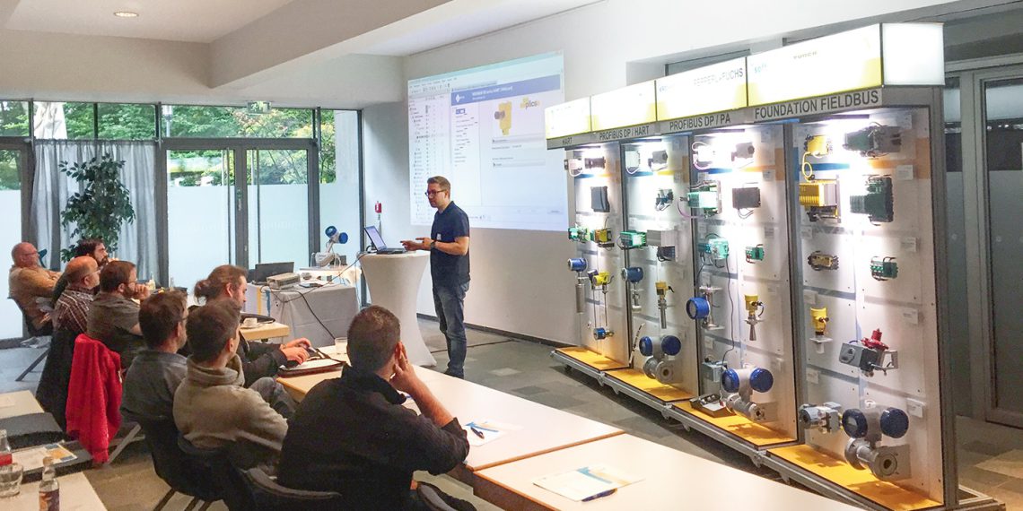 Im Vor­der­grund der Ver­an­stal­tung stand der prak­ti­sche Nut­zen der am wei­tes­ten ver­brei­te­ten FDT-Rah­men­ap­pli­ka­ti­on Pact­wa­re. Die­se ver­ein­facht und beschleu­nigt die Arbeit mit ver­schie­dens­ten Feld­ge­rä­ten erheb­lich. Dies wur­de mit Hil­fe von Note­book und mobi­len Gerä­ten an einer Demo­wand vor­ge­führt. Zum Ein­satz kamen dabei Gerä­te mit Foun­da­ti­on Fiel­dbus, IO-Link, Hart und Pro­fi­bus. Sowohl Punkt-zu-Punkt als auch Netz­werk­ver­bin­dun­gen wur­den behandelt.