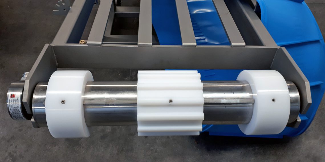 Rulmeca Germany stellt für die Superdrive Gurte von Volta eine Trommelmotor-Auslegung mit glatter, PE1000 (UHMWPE) basierter, Aufsteckverzahnung vor, um TPE-Gurte (Thermoplastische Elastomere) möglichst geräuscharm und übersprungfrei anzutreiben. Dies ist mit anderen form-schlüssigen Antriebsvarianten aus Edelstahl oder PUR (Polyurethan) eine Herausforderung, vor allem in trockenen und gekühlten Fertigungsumge-bungen. In solchen Fällen neigt der Förderer aufgrund des hohen Reibungskoeffizienten (CoF) zwischen dem TPE-Gurt und dem Edelstahl- oder PUR-Mantel zu knarren oder gar überzuspringen. Die vorgestellte PE1000-basierte Aufsteckverzahnung für Trommelmotor-angetriebene TPE-Gurte ist die friktionsärmere Alternative, die einen reduzierten Lärmpegel und einen reibungslosen Lauf des Gurtes ohne abruptes Ablösen oder Über-springen gewährleistet.