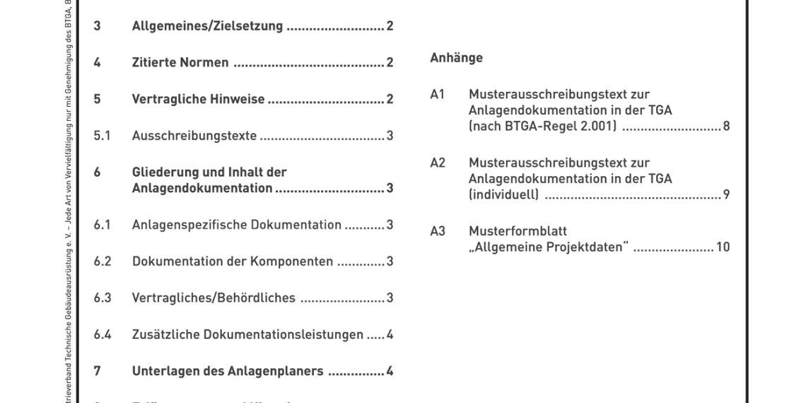Der BTGA – Bundesindustrieverband Technische Gebäudeausrüstung e.V. hat die BTGA-Regel 2.001 „Anforderungen an die Anlagendokumentation in der TGA“ überarbeitet. Experten aus den verschiedenen Fachbereichen des BTGA haben die Regel 2.001 an den aktuellen Stand der Technik angepasst. Sie ist zum Preis von 18,70 Euro (inklusive Mehrwertsteuer, zuzüglich Versandkosten) beim Beuth Verlag unter www.beuth.de oder über den BTGA-Webshop erhältlich: www.btga.de > Publikationen > BTGA-Webshop.