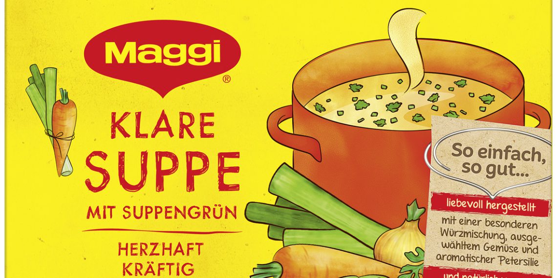 Die Traditions-Produkte Maggi Brühwürfel, klare Hühner Suppe Extra, Fette Brühe und Gekörnte Brühe, seit 30 Jahren mit ihrem bewährten Geschmack erfolgreich und beliebt, bleiben indes unverändert.