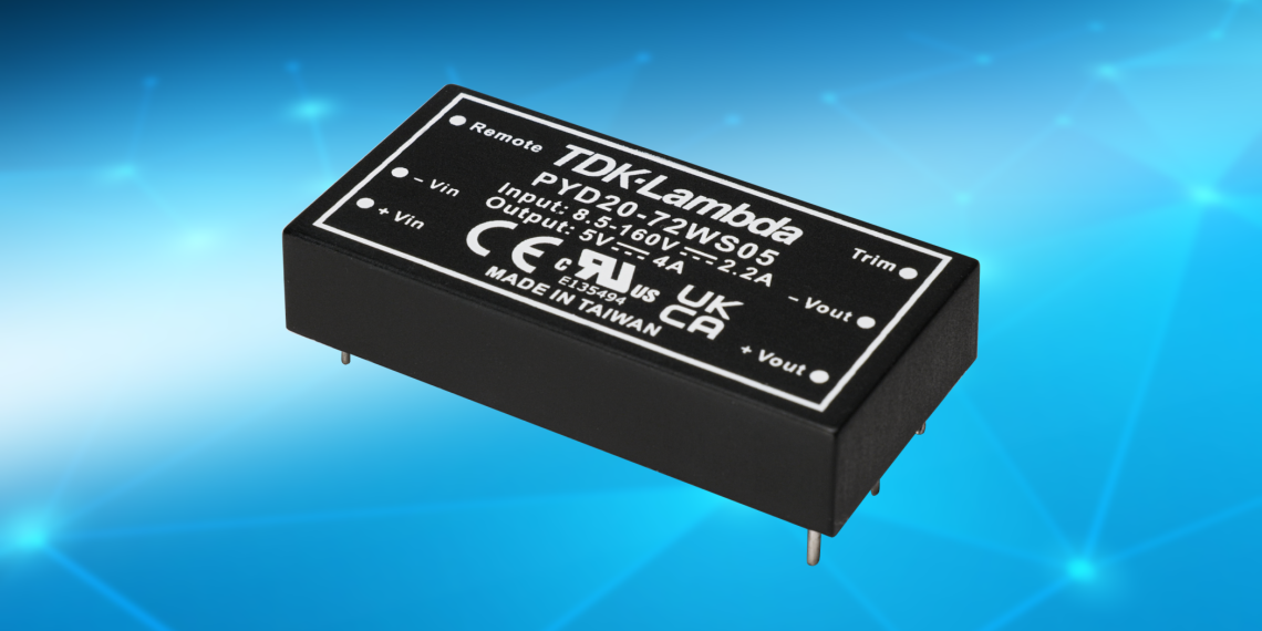 Die leiterplattenmontierbaren Wandler der 20W-DC-DC-Wandlerserie PYD20 von TDK-Lambda verfügen über einen ultraweiten Eingangsbereich von 8,5 bis 160 Volt Gleichstrom (18:1) und sind in einem Gehäuse im 2″ x 1″ Industrieformat mit den Abmessungen 50,8 x 25,4 x 10,2 Millimeter (L x B x H) eingebaut. Die Wandler sind silikonvergossen, um ein hohes Maß an Schock- und Vibrationsfestigkeit zu gewährleisten, was für Anwendungen gemäß EN 50155, der Norm für elektronische Geräte in Schienenfahrzeugen, von Vorteil ist. Zu den Anwendungsbereichen gehören auch Industrie- und Messgeräte, welche von einer Gleichspannungsquelle oder einem batteriegestützten System versorgt werden.