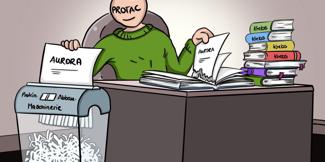 Die Wissenschaftler setzen dafür auf sogenannte PROTACs (proteolysis targeting chimeras). Bei ihnen handelt es sich um kleine Moleküle, die an Zielproteine binden und diese der zellulären Abbaumaschinerie – einer Art „Schredder“ im Zellinneren – zuführen. Für Aurora‑A haben Wolf und sein Kollaborationspartner, Professor Stefan Knapp von der Goethe-Universität Frankfurt, das entsprechende Molekül vor ein paar Jahren entwickelt. JB170 – so dessen wissenschaftlicher Name – ist eines der ersten Moleküle der PROTAC-Substanzklasse, das in Deutschland hergestellt wurde. Mit zahlreichen weiteren PROTAC-Molekülen in der Entwicklung gehören die Teams aus Würzburg und Frankfurt zu Europas führenden akademischen Arbeitsgruppen auf diesem Feld.